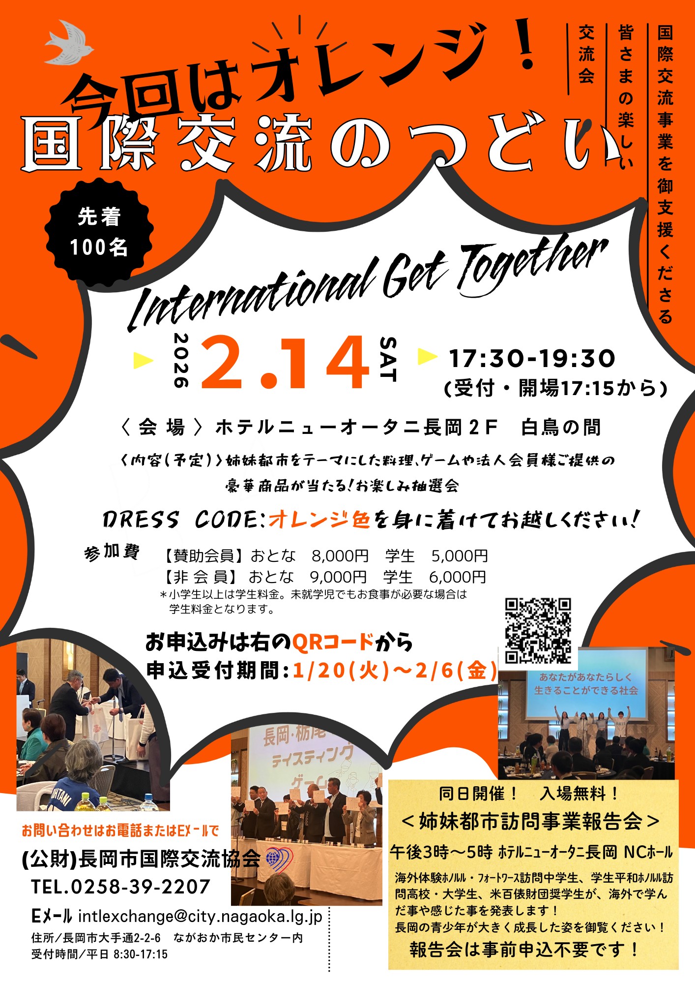 お知らせ 2026.1.7 令和7年度「国際交流のつどい」を開催!(2/14(土)17:30-19:30) (公財)長岡市国際交流協会を御支援くださる皆さまの楽しい交流会「国際交流のつどい」を2月14日(土)17:30からホテルニューオータニ長岡で開催します。今年のテーマカラーはオレンジです!